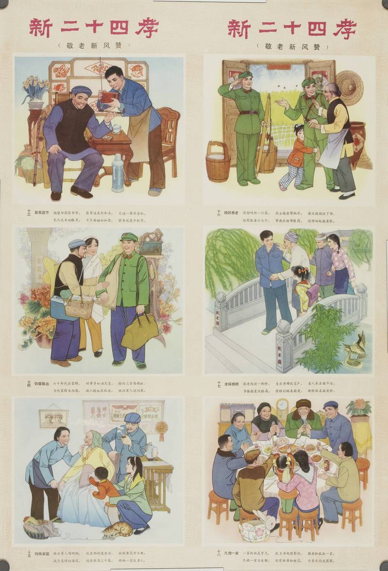 This Chinese poster is titled “The New Twenty-Four Exemplary Examples of Filial Piety.” This is a modernized version of a classic Yuan dynasty text, designed to promote moral values and respect for elders in contemporary society.