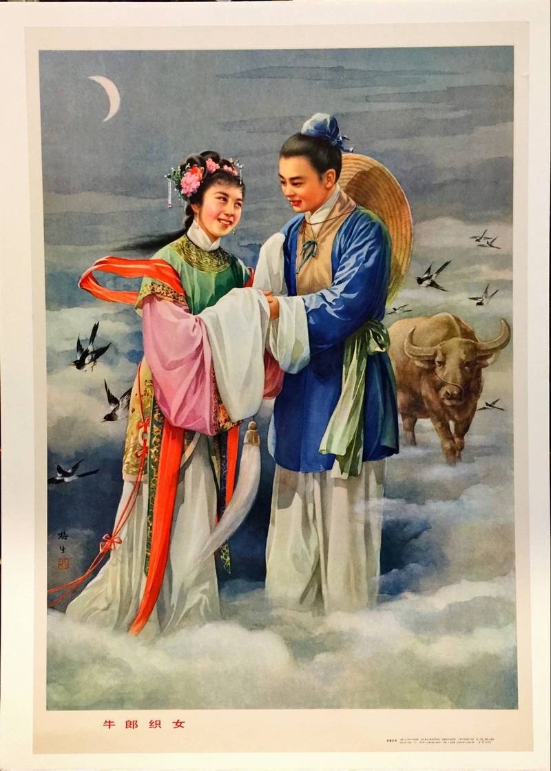 This image depicts the famous Chinese folklore legend of Niulang and Zhinü (The Ox Herder and the Weaver). This particular artwork is a New Year’s poster print (nianhua), created by the artist Jin Meisheng around 1980.