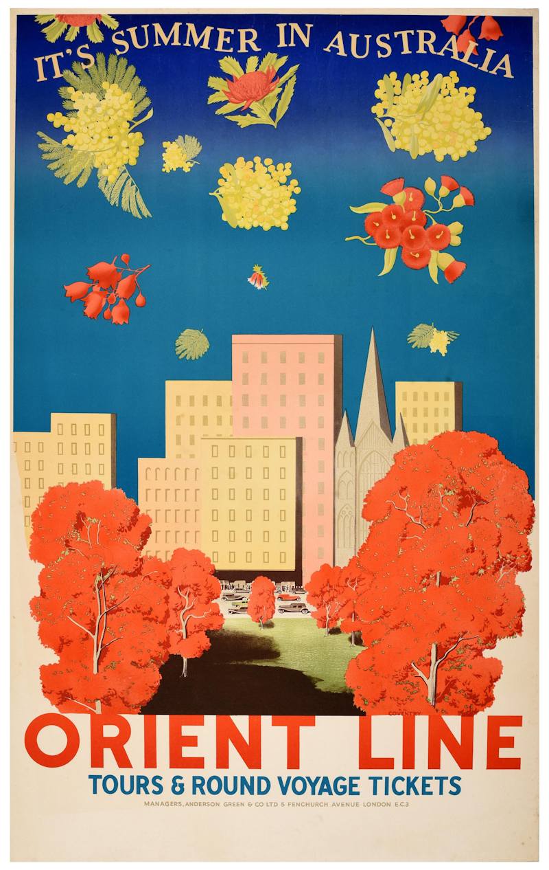 Art Deco style advertising poster from the 1930s, created to promote Orient Line cruises to Australia. The poster was illustrated by Frederick Halford Coventry (also known as Fred Coventry), a New Zealand painter and designer. Entitled “It’s Summer In Australia,” the poster promoted tours and round-trip tickets.