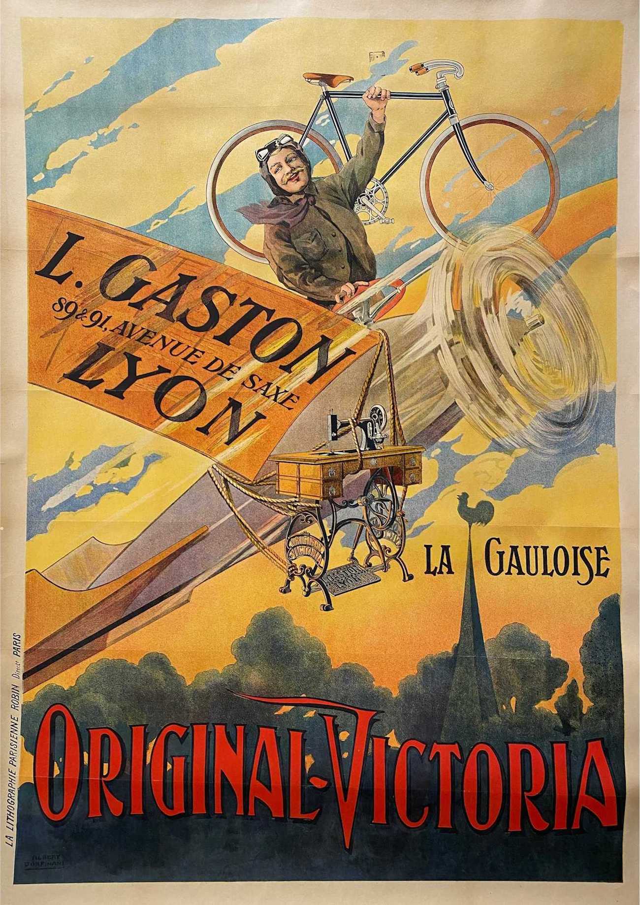 L. Gaston Lyon ‘ORIGINAL VICTORIA’ is a vintage poster advertising the “Original Victoria” sewing machine, dated circa 1914. The poster features a figure of a man in aviator glasses flying in an airplane carrying a sewing machine.