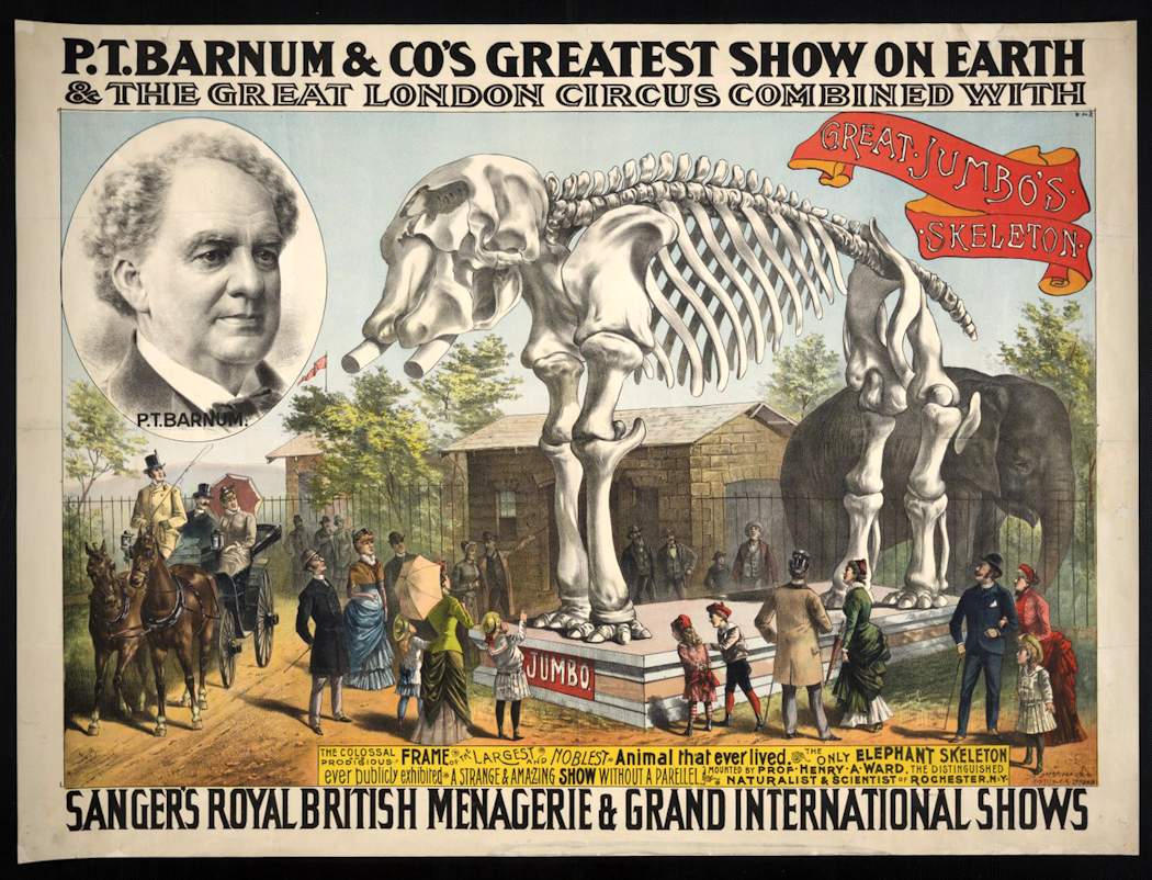 The poster shows the skeleton of Jumbo the elephant. Jumbo was an orphaned Sudanese Elephant that was originally sold to Paris zoo and then to London Zoo.