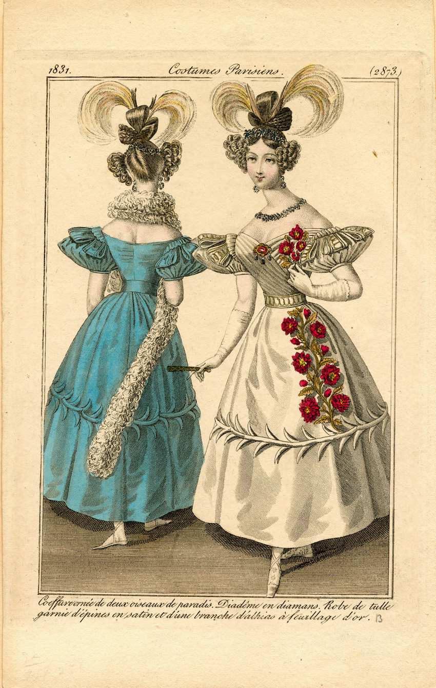 Two women wearing Paris dresses from 1831. The woman on the right wears a white dress with wide, puffed, short sleeves. She wears a red and gold brooch with three hanging pearls pinned to the bodice. Attached to the tops of her sleeves are epaulets of folded white and gold ribbon. She wears a white and gold ribbon belt. The skirt is decorated with a gold vine with red flowers. She wears white ballet slippers and long white gloves. She holds a fan in her right hand and a small bouquet of the red flowers similar to those decorating the dress in her left hand. She wears a silver flower necklace and earrings, and a silver flower diadem in her hair. Her hair is in a braided and looped bun decorated with two large feathers. The woman on the left shows the viewer the back view of the same dress. Her dress is blue with the same details and she wears the same ornaments and hairstyle.