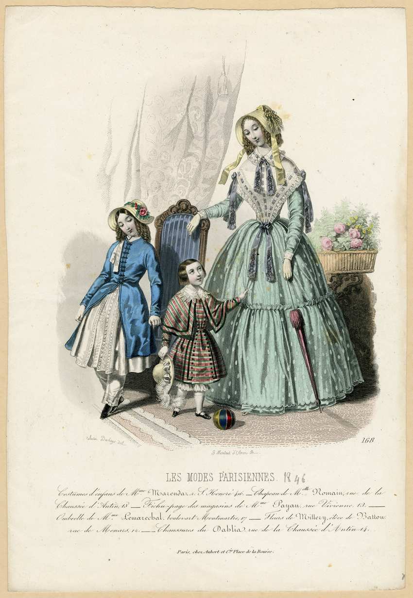 A woman and two children stand in a well-appointed parlor. The older girl, who leans against the arm of a blue-striped silk upholstered chair, wears a blue redingote fastened with buttons to the waist. Her white elaborately-embroidered dress, with a long line of tiny white buttons, is visible at the front. Underneath she wears white lace-trimmed pantalettes over black shoes. Her straw bonnet, trimmed with pink roses and greenery, is tied over her brown ringlets with a white ribbon.