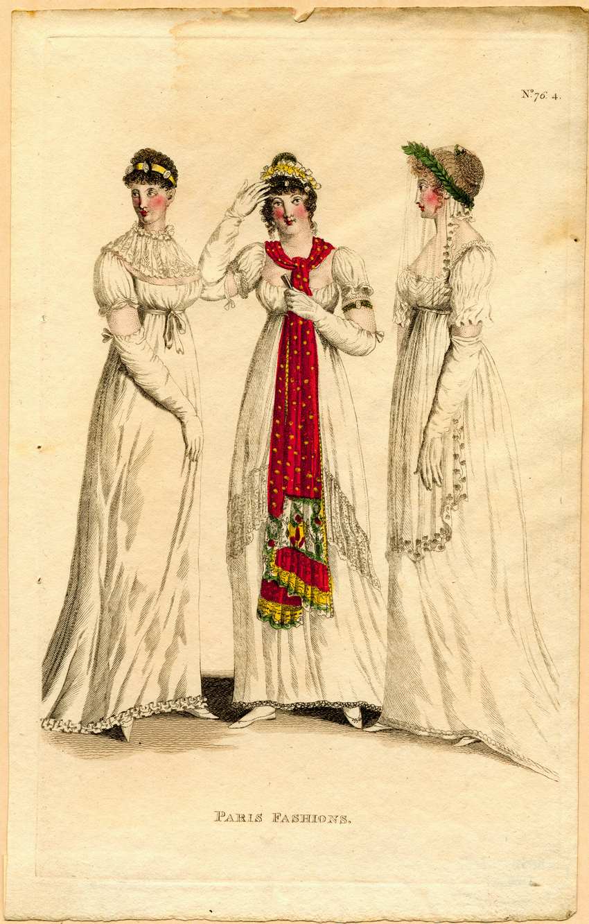 Three women in Paris fashions. All women wear short-sleeved white empire-waisted dresses. The woman on the left wears a white ribbon tied in a bow at the waist, and her skirt has a ruffle at the hem. The bottoms of her sleeves are gathered and she wears long white gloves and a neck and shoulder covering made of ruffled, patterned lace. She wears a gold head band with oval decorations on it.