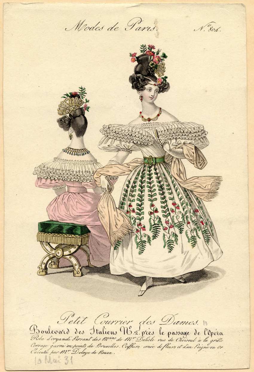 She wears matching red and gold earrings and a gold fillet with a central red stone. Like her companion, her elaborate coiffure is decorated with sprays of pink flowers, including roses, and a large, gold and white comb. Her hair has an asymmetrical parting. She has a fringed, pale peach shawl draped over her arms, and carries a closed, white fan in her left hand. “13” has been written in pencil to the right of the line of text, which reads “Petit Courrier des Dames.” “10 Mai 31” has been written in pencil in the lower left.