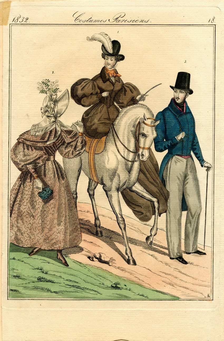 At the centre of the scene, a woman rides side-saddle wearing a dark brown riding habit. Her sleeves follow the fashionable leg-of-mutton style. Additionally, the garment features a narrow fold-over velvet collar that enhances its refined appearance.