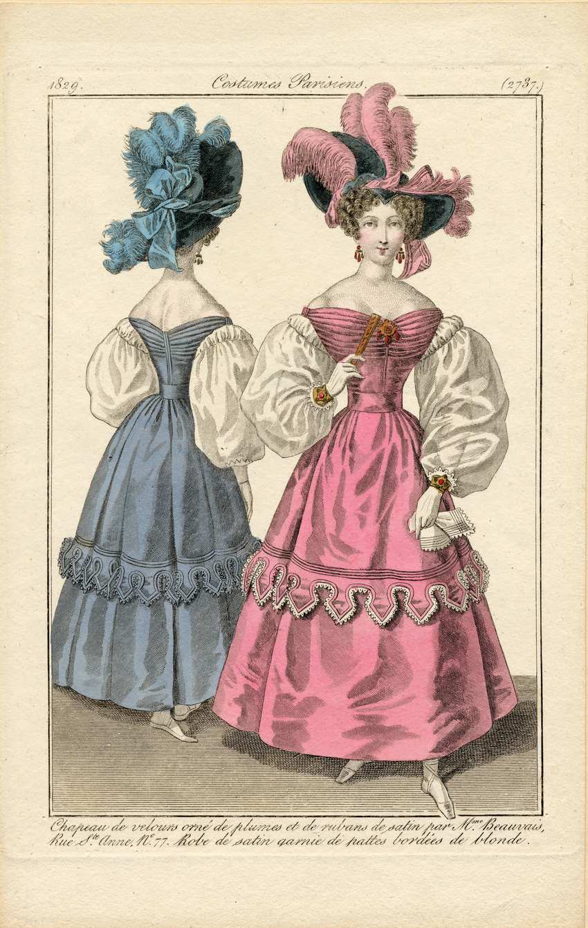 Two women in Parisian dresses for 1829. The woman on the left has her back to the viewer. She wears a black, wide brimmed hat with blue ribbon bows and blue feathers decorating the top. She wears a pair of dangling, triple-teardrop earrings. Her dress is blue with large, puffed, white sleeves. The bodice is pleated horizontally with a vertical seam down the back. The blue skirt is plain, except for a decorative band of points hanging below a row of tucks.