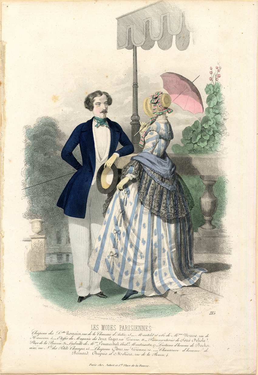 A man and woman are talking in the park. The man is wearing a navy blue hip length jacket that is fitted in at the waist. His shirt is white with a faint stripe, and his white vest opens low, and reaches just below his waist. He is wearing a green scarf tied around his neck over his tall collar points. His trousers are pinstriped gray. He is wearing tan gloves and is holding a black opera hat. He is holding a narrow cane behind his back as he rests his elbow negligently on a stone balustrade. The woman is wearing a white and blue striped dress with little bows down the side of the skirt. The dress has a fringe edged yoke and bias-cut narrow sleeves. She has a blue shawl trimmed with black lace ruffles draped over her elbows. Her straw hat has bands of brown spotted trim, perhaps fur, around it and is trimmed and tied with pink, blue, and white plaid ribbons. She holds a small pink parasol and is wearing light tan gloves.