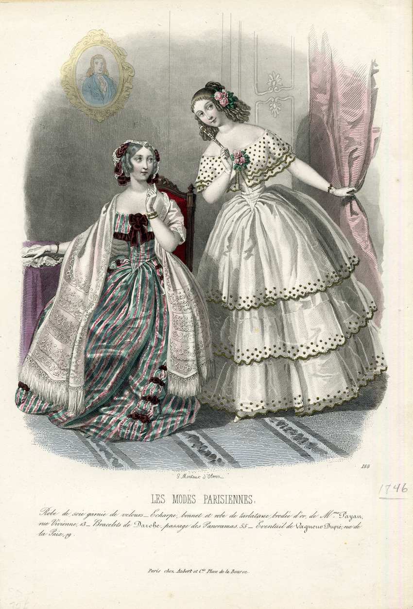 Two women in a parlor. The woman on the left is seated in an ornate wooden chair with deep red upholstery. She wears a lace cap with maroon bows over her ringlets. Around her shoulders is a long white shawl with intricate embroidery and fringed hems. Her dress is green and pink striped with a wide, off the shoulder, folded collar. The collar is trimmed with maroon ruffles and at the center is a large maroon bow.