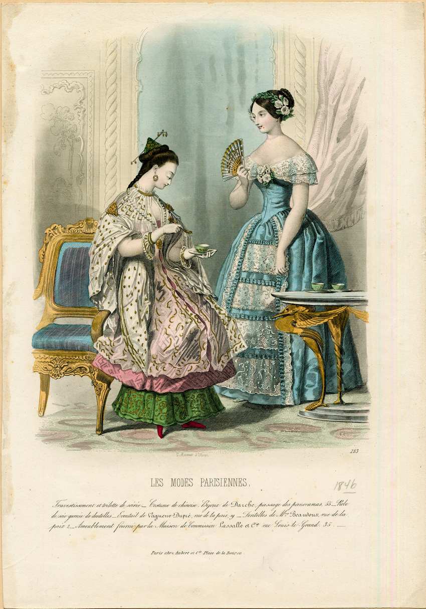 There are two women in a parlor. The one on the left rests against the arm of an elaborately carved chair with blue upholstery. She wears Chinese inspired attire. Her hat is a small green and gold pyramid held on with an elaborate gold hair pin. Her dress is pink with a green and gold brocade underskirt in the same style as her hat, and her slippers are red. Over her dress she wears a white lace mantelet with a gold pattern, gold brooches or clasps at each shoulder, and long bell sleeves, with a long strand of pearls worn over it. She wears large red and gold earrings, white gloves with gold cuffs, and holds a green tea cup and saucer and a spoon. The woman on the right stands with a laurel wreath with white flowers on her hair, and holds a white and gold fan in her right hand. Her dress is light blue satin with an off the shoulder neckline and short sleeves. Two white lace tiers edge the neckline, with a corsage of white flowers at the center. The dress has a decollete neck and a pointed waist. Four tiers of white lace edged with ruching decorate the front of the skirt. There are two more tea cups and saucers sitting on the table to the right. The small table has gold legs in the shape of egrets or herons, and there is white drapery behind the two women.