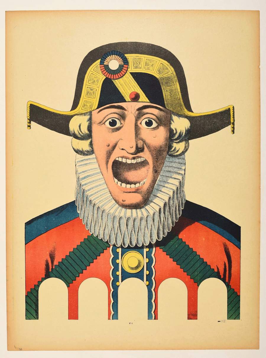 The figure is Polichinelo, a comical and mischievous character originating from the Italian Commedia dell’arte, known as Pulcinella. The image was printed using the stone lithography technique (chromolithography), known for its vibrant color and detail.