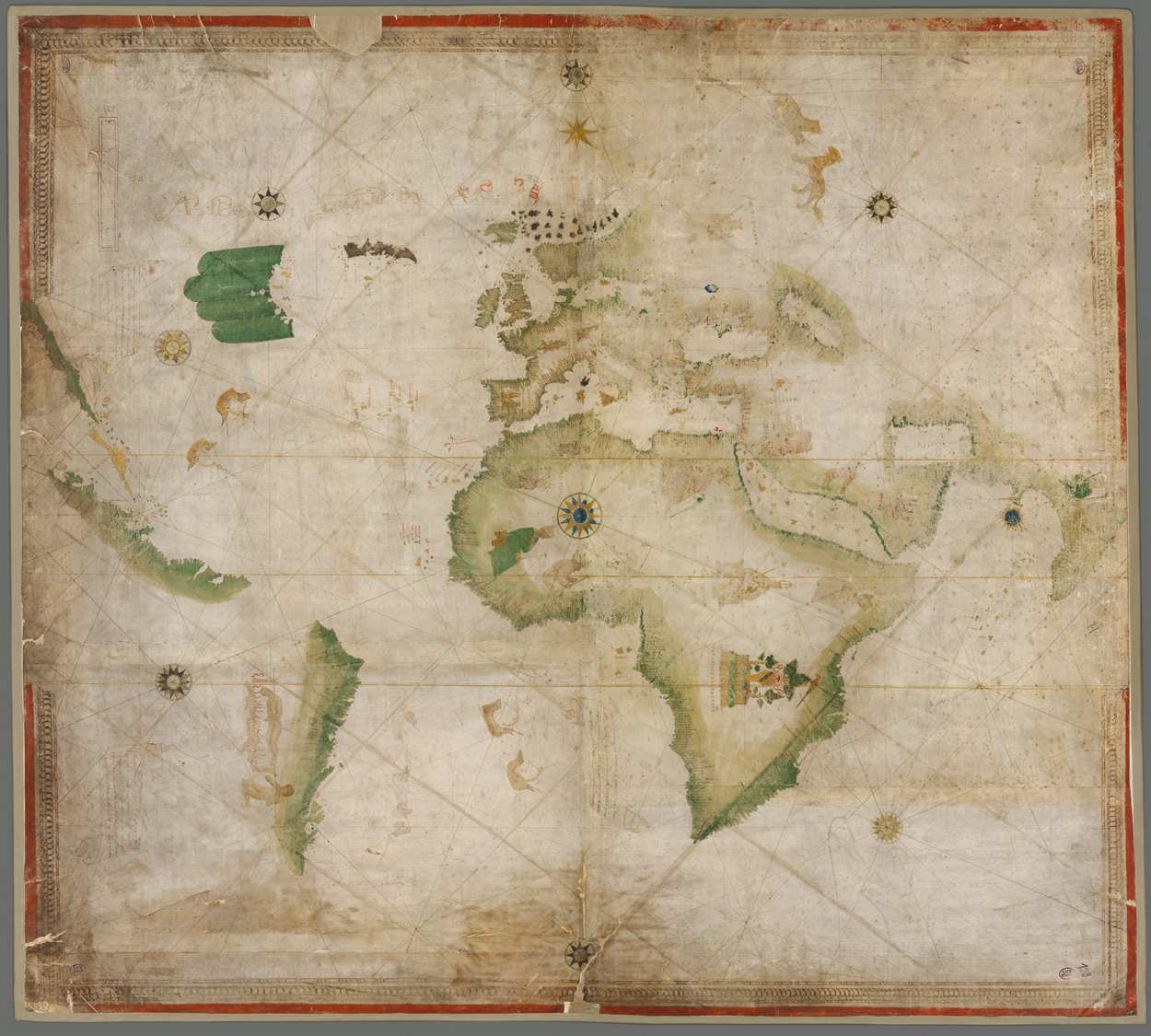 Dating from the period circa 1502-6, it already records the discoveries resulting from the voyages in 1501 of the Portuguese explorer Miguel Corte-Real (circa 1448-circa 1502) and the Italian explorer and navigator Amerigo Vespucci (circa 1451/54-1512). Corte-Real charted, in North America, Terra de Lavorador (parts of present-day Greenland) and Terra Corte Real (Newfoundland and Labrador).