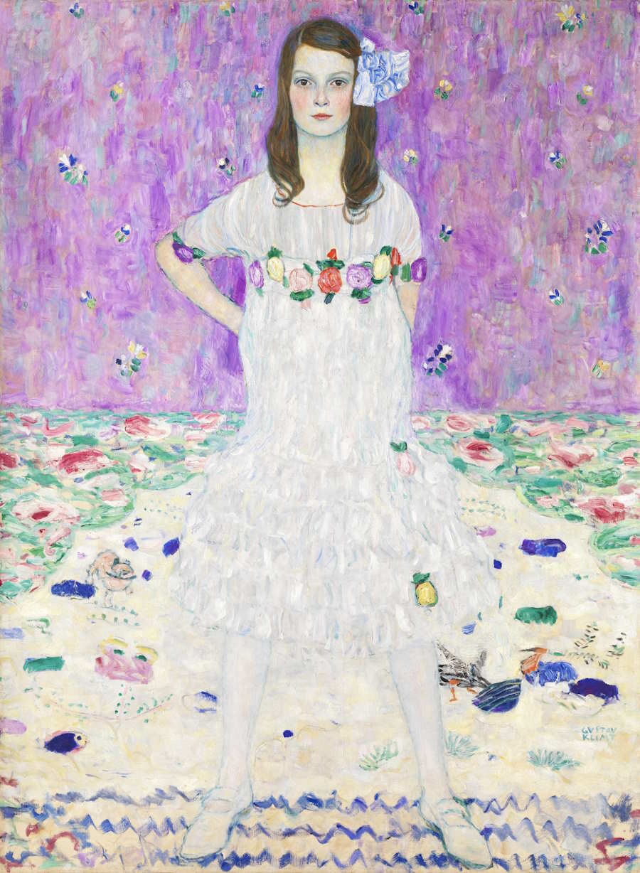 The subject is Mäda Primavesi, the nine-year-old daughter of the wealthy banker and industrialist Otto Primavesi, a patron of Klimt. Klimt depicted her with a confident posture and a piercing gaze, which conveys a remarkable degree of self-possession for a young girl.