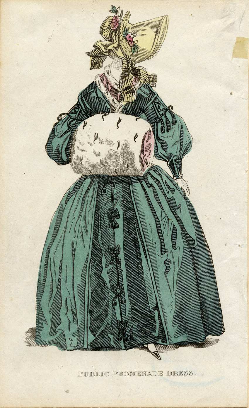 A woman appears in public promenade dress for 1838. She faces the viewer but her head is turned to the right and hidden by her hat. She wears a pale yellow bonnet with a wide brim. Pink flowers with green leaves and yellow ruffles decorate the crown and the side. Pale yellow ribbons with black stripes decorate the back of the hat and tie under the chin. Her dress is hunter green with ermine detailing. The collar is pink, edged on either side by ermine fur. The bodice is covered by a very large ermine muff that she holds with one hand. Her sleeves are adorned with hunter green rope lacing, with the end tassels hanging free. The majority of the sleeve is puffed with a rope laced cuff. The skirt is very full and has rope bows, tying the two sides together. She wears a pair of black ballet flats with white stockings and a pair of white gloves.