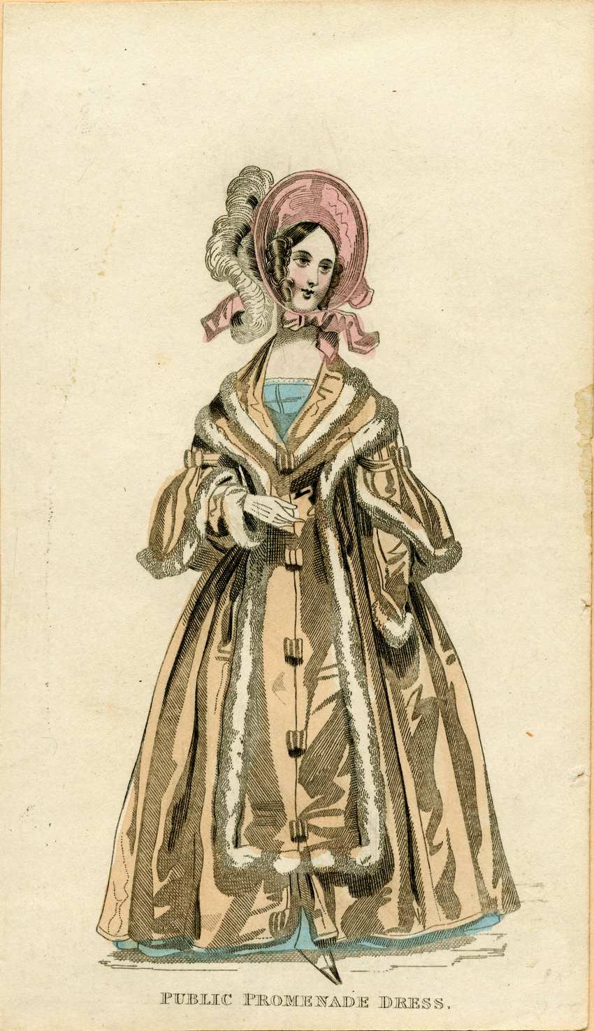 A woman wears a pink bonnet with a long white feather plume, a pale blue dress, and a yellow coat with white fur edging. The coat has five wide flat bows or clasps down the front, and fur trim along the bodice, sleeves, and cuffs.