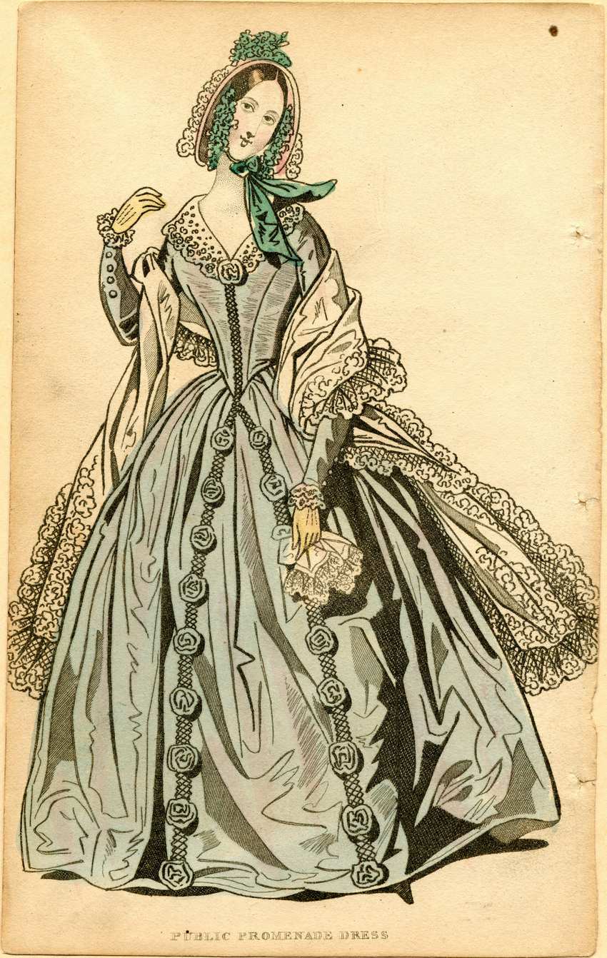 A woman wears a pink bonnet adorned with green flowers and ribbons. She has a light blue dress with a low v-neck accentuated with blue rosettes and netting down the center front of the skirt, with buttons on the sleeves and a white lace collar and ruffled lace cuffs. She wears a white lace shawl edged with a lace ruffle over her elbows, and holds a white lace handkerchief.