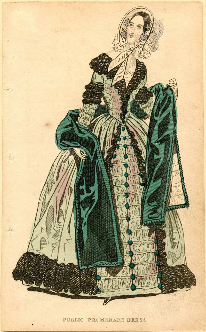 A woman wears a white bonnet with flowers, a plume, lace and ribbons. She wears a bright green shawl over her elbows. Her dress is green with pink, ruched on the sleeves and bodice, and trimmed with black lace ruffles on the sleeves, collar, and center front. Her dress has a decollete neck with a lace insert, a bell shaped skirt, and an underskirt with ruched bands trimmed with round green buttons.