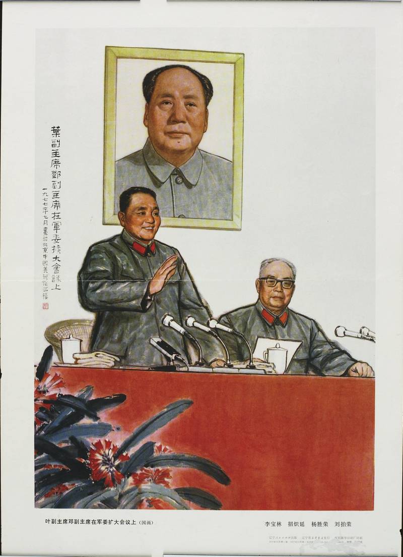 A 1977 Chinese propaganda poster depicting Vice Presidents Deng Xiaoping (left) and Ye Jianying (right) presiding over a session of the Central Military Commission. In the background is the iconic portrait of Mao Zedong, symbolizing ideological continuity after his death.