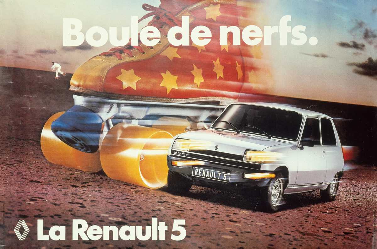 This is a commercial for the classic Renault 5, highlighting its energetic and compact character. The main tagline, “Boule de nerfs” (Ball of nerves), emphasizes the vehicle’s agility and performance.