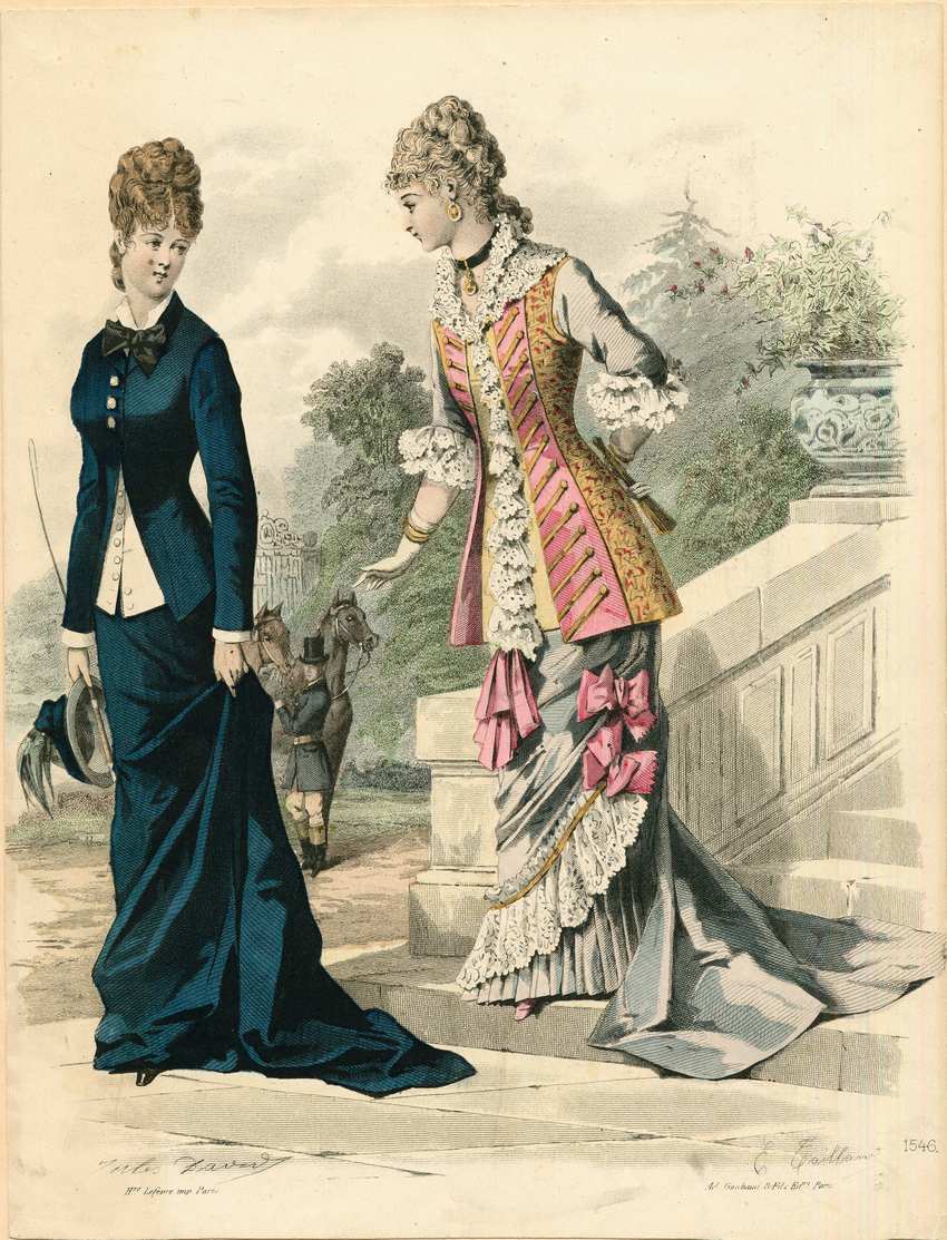 Two women are depicted at the base of an outside stairway. The woman on the left wears a royal blue riding habit. Her hair is dressed up in curls and she holds her hat and riding crop in her right hand. In her left hand she holds up the long skirt of the habit. She has a black bow tied at her neck, over a white standing collar. Her long sleeved jacket has three white buttons at the bust, and is open beneath. Underneath her jacket she wears a white center buttoned vest, which like her jacket is hip length. The woman on the right also wears her hair dressed up in curls, with one curl loose at the back.