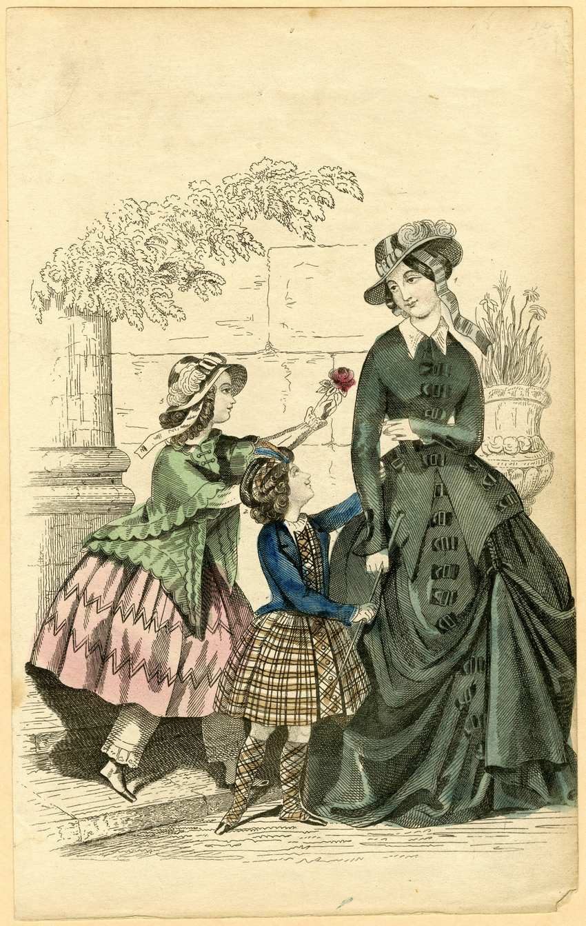 Her hat has a moderate brim and is decorated with green feather plumes and ribbons. Two children stand next to her reaching toward her. The older child is a girl, handing a red rose up to the woman. She wears a pink dress decorated with two horizontal bands of zigzags. The skirt reaches just below her knees and is very wide and full. Under the skirt she wears white lace trimmed pantaloons. She is wearing either white stockings and low black slippers, or shoes with white uppers or spats. Her blouse is white with long sleeves with lace ruffles at the wrists. A green shawl with scalloped edges is draped over her upper body and fastened with two clasps at the neck. Her white bonnet is trimmed with feathers and ribbons. Next to her is a smaller child, probably a boy “not yet breeched,” but possibly another girl.