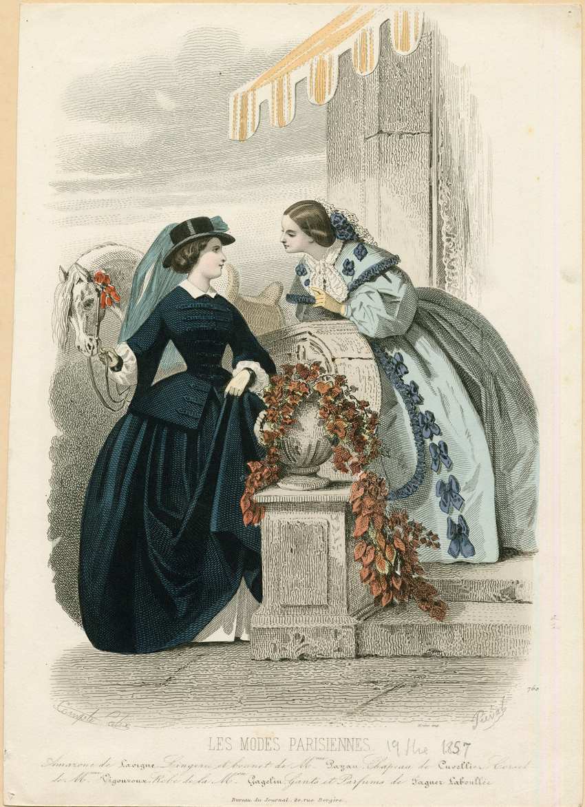 Two women stand outside a building. The woman on the left holds the reins of a white horse standing behind her. The horse has pink rosettes decorating its bridle. She is dressed in a deep navy blue riding habit. Her hat is shiny black with a low crown in a masculine style, with a blue veil. Her blouse is white with a plain white collar and long full sleeves gathered at the wrist. The jacket has bell sleeves and horizontal military style buttoned bands across the bodice and peplum of the jacket. The woman on the right wears her hair swept back smoothly into a low bun, accented with blue flowers and white lace at the back. She has a white lace collar with lappets. Her dress is light blue with dark blue ruffled edging and dark blue bow accents. The dress has long full sleeves gathered at the wrist.