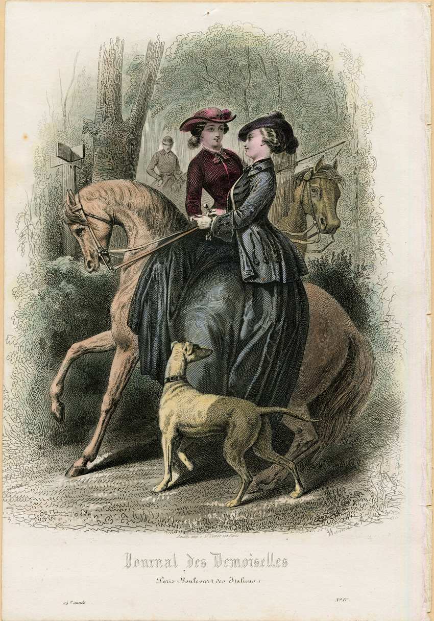 Two women are depicted riding their horses in a wood. The woman in the back wears a maroon flat brimmed hat with a matching plume. Her hair is in a low bun and her jacket, in a matching maroon, has a plain collar and is long sleeved. The woman in front wears a purple hat with a veil in back and her hair in a low bun, like the first woman. She is riding sidesaddle in navy riding habit. Her jacket has military elements, such as large cuffs and a tasseled trimmings on the cuffs and bodice. In the front a hunting dog, and in the back is a lightly sketched figure of a man on horseback. There is a wooden sign post with four arms near the riding path.