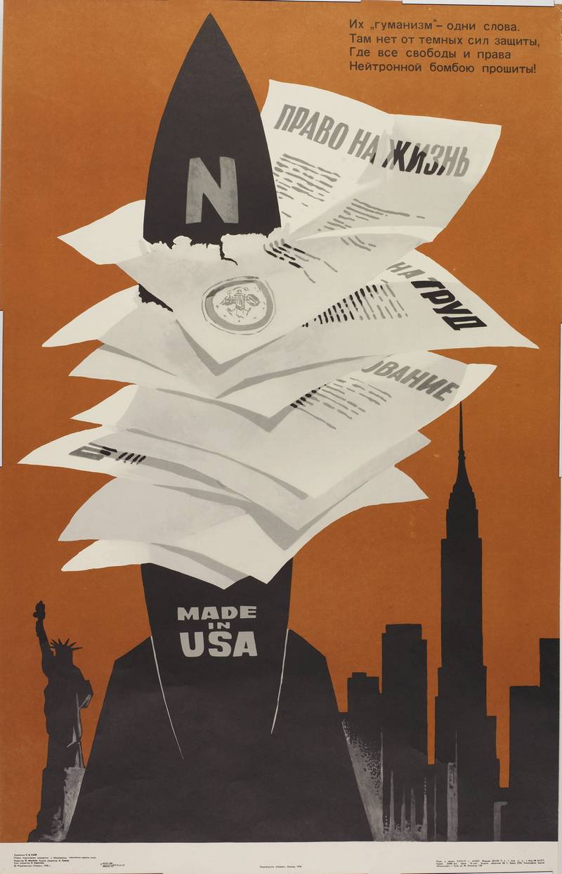In the center, you see a missile or bomb with the letter “N” (referring to the neutron bomb) and the inscription “MADE IN USA” at the base. The bomb is tearing through several documents. The papers that the bomb goes through contain texts in Russian that represent fundamental rights (to life, to work and to education).