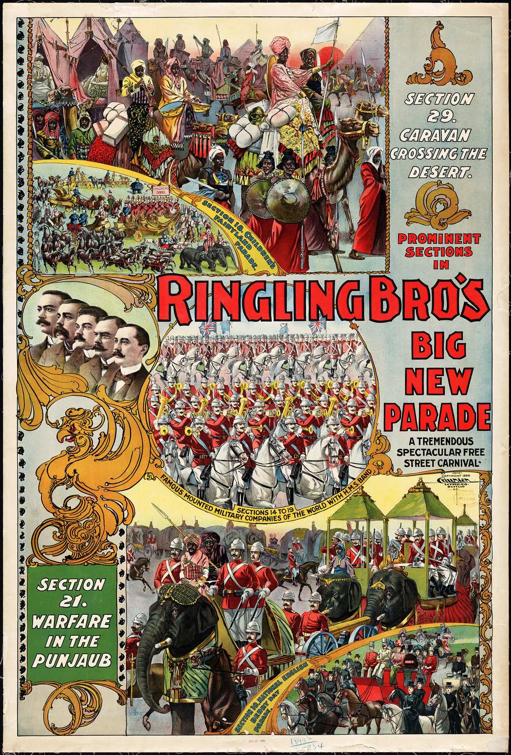 Large old circus poster (1899) showing five separate parades of people in costume and animals. The parade represents a “caravan crossing the desert,” “children’s fairyland,” “famous mounted military companies of the world,” “warfare in the Punjab,” and “national English derby day.”