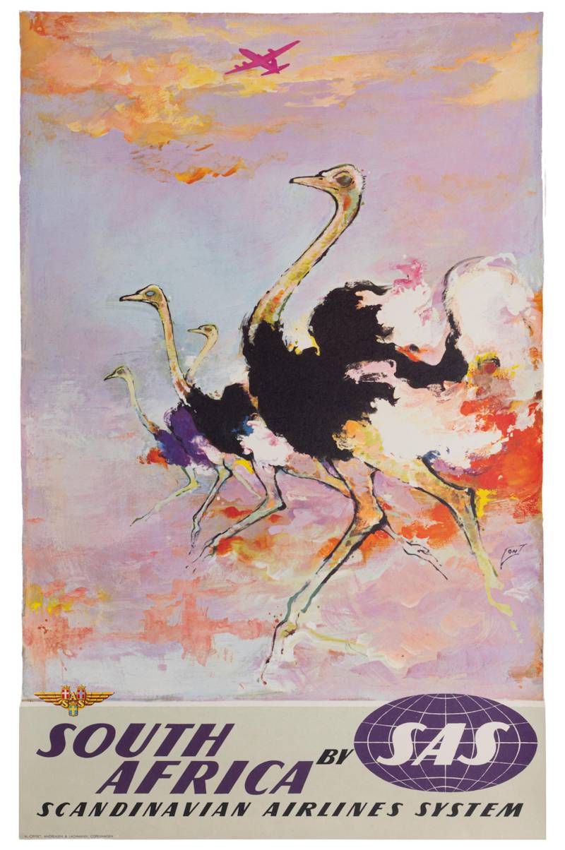 Vintage promotional poster from Scandinavian Airlines System (SAS) for travel to South Africa. The poster illustrates ostriches running under an airplane, symbolizing African wildlife and air connectivity.