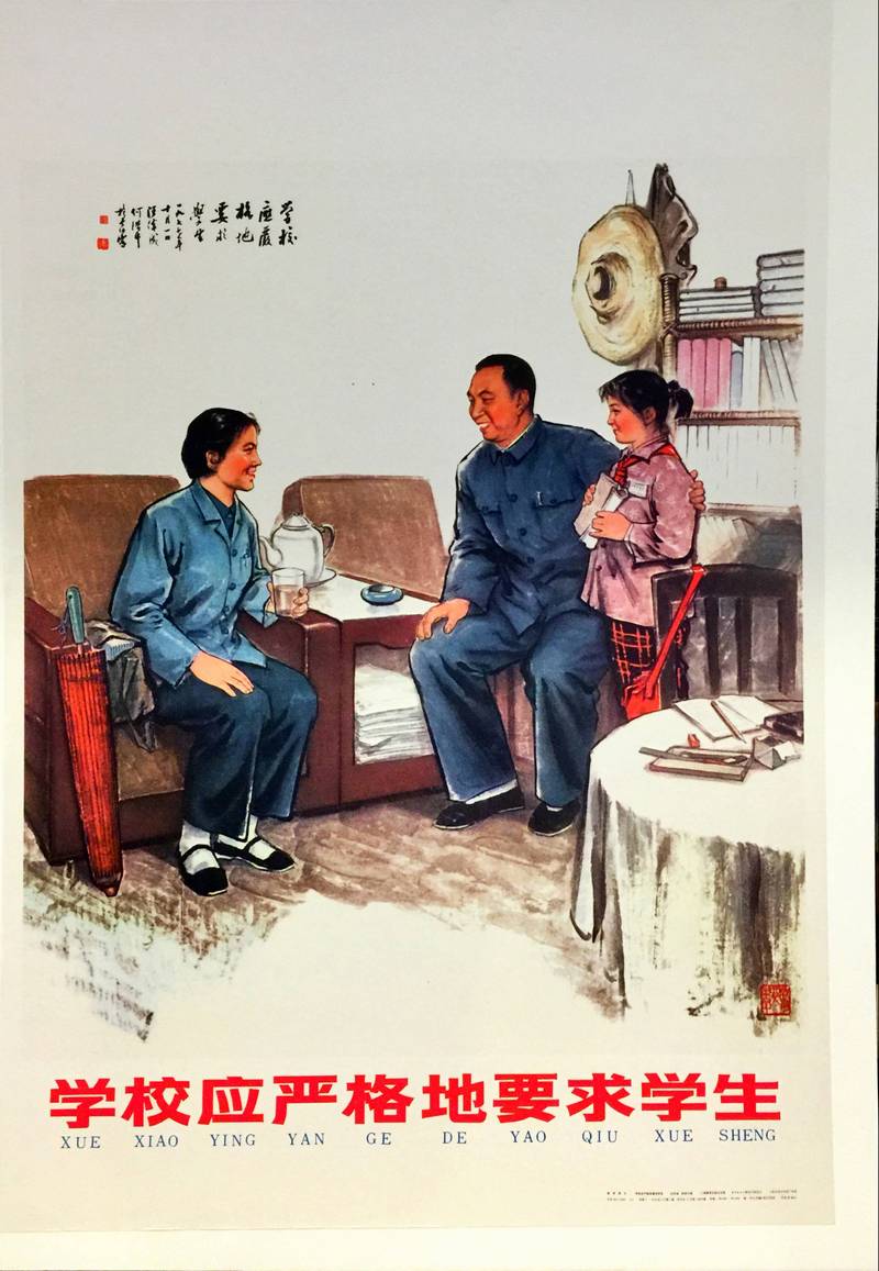 Chinese propaganda poster, titled “Schools must demand rigor from students.” The scene depicts a home visit by teachers to Hua Guofeng, Mao Zedong’s immediate successor after his death in 1976. In the image, Hua Guofeng (center) is shown as a caring father and humble leader, receiving teachers to discuss the educational progress of one of his children.