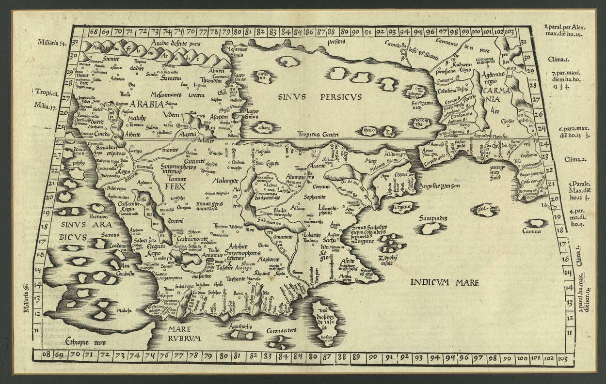 Shown here is his April 1525 print of Ptolemy’s Tabula VI Asiae (Sixth map of Asia), published by Johann Koberger (circa 1454-1543) in Argentorati (i.e., Strasbourg). The text was translated into Latin by Willibald Pirckheimer (1470-1530), a scholar from Nuremberg. The map is dominated by the Arabian Peninsula.