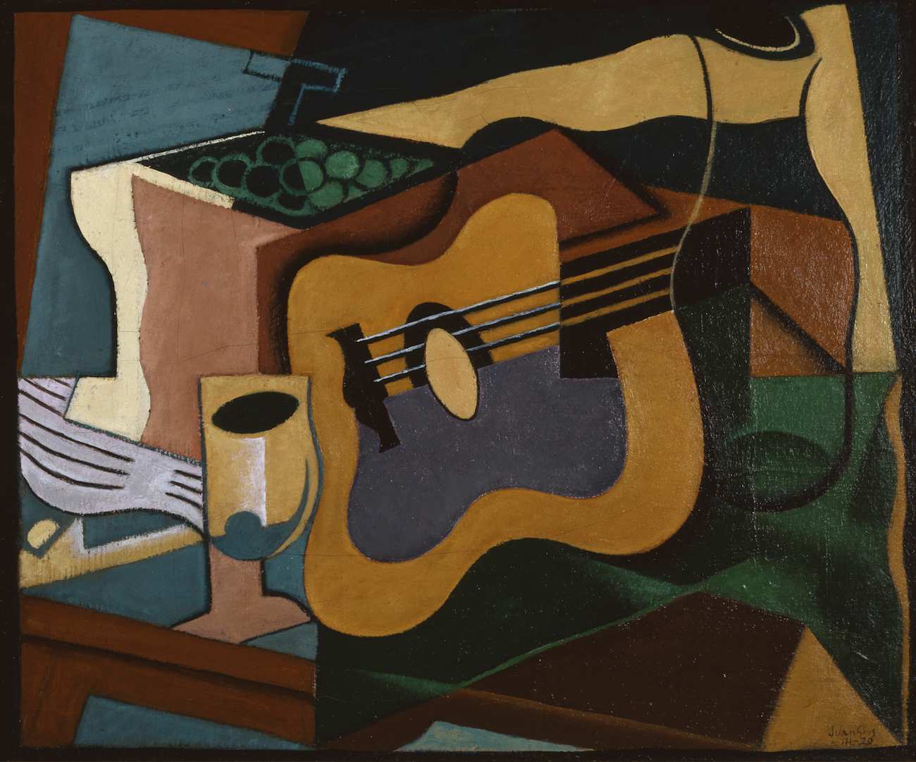 Interlocked in a harmonious geometric pattern, patches of subdued shades of brown, green, and blue give form to a guitar, a sheet of music, a bowl of grapes, a goblet, a carafe, and a table.