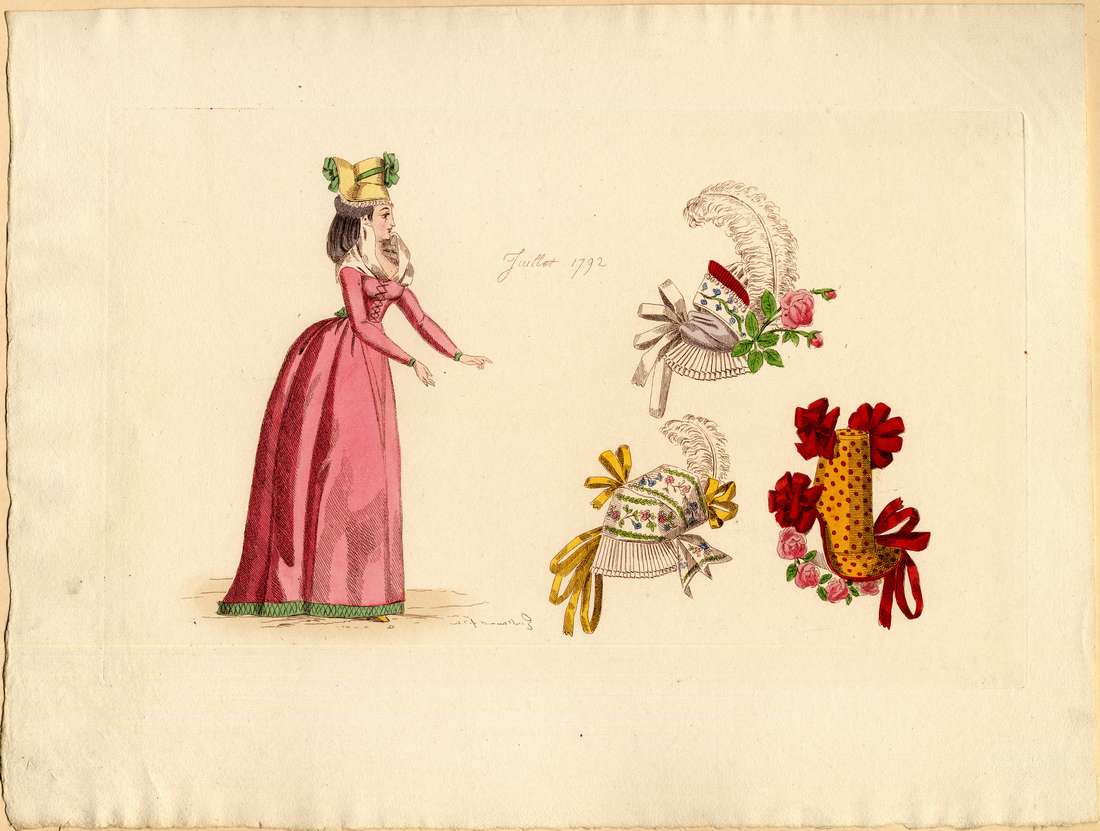 A woman wears a pink dress with a tight, laced bodice and narrow sleeves trimmed in green at the cuffs. The skirt is long and full and has a band of green at the hem. Her pointed yellow shoe is just visible beneath the dress. A white fichu covers her shoulders and neck, and a green ribbon marks the rear joining of skirt and bodice.