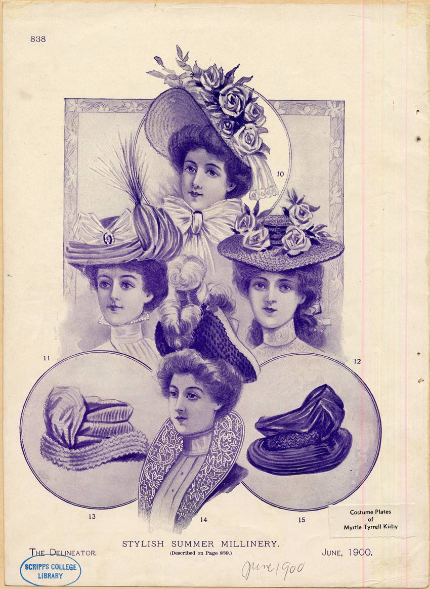 Printed in blue ink with no colors. There are four women in hats with two extra hats on either side of the woman on the bottom. They are backed with a rectangular decorated frame, and three circles setting off the woman at the top and the two hats in the bottom row. The woman at the center top wears a large white pleated bow at her neck. Her hat is a straw, with a curved brim decorated with a group of roses, with leaves and a lace fall at the side.