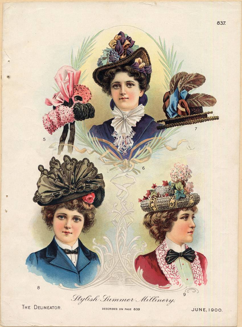 The left hat is of bright pink and black poufs, with black ribbon ties, and pink upstanding cockades of ribbon. The hat on the right hat is a brown straw flat-brimmed boater decorated with brown feathers and pink and blue ribbon. The woman on the bottom left is wearing a blue jacket with a velvet collar over a white shirt with an upstanding collar and a small blue bow tie. Her hat a brown straw with a pink rose on the underside of the brim and a standing brown ruffle with ornamented edges covering the top.