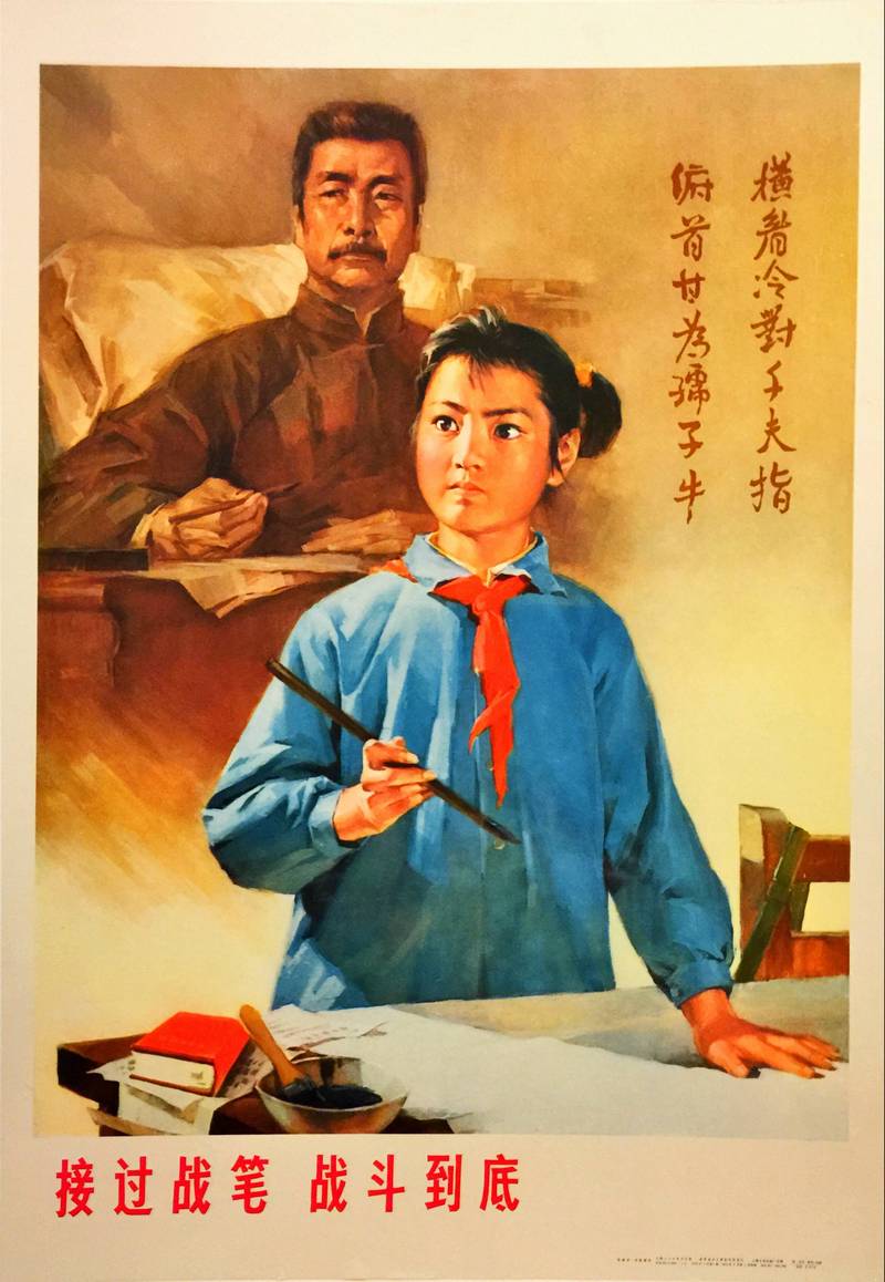 Lu Xun (1881–1936) is in the background, considered the father of modern Chinese literature and an icon for revolutionaries. His presence suggests that the young girl is inheriting his spirit of “fighting with the pen.”