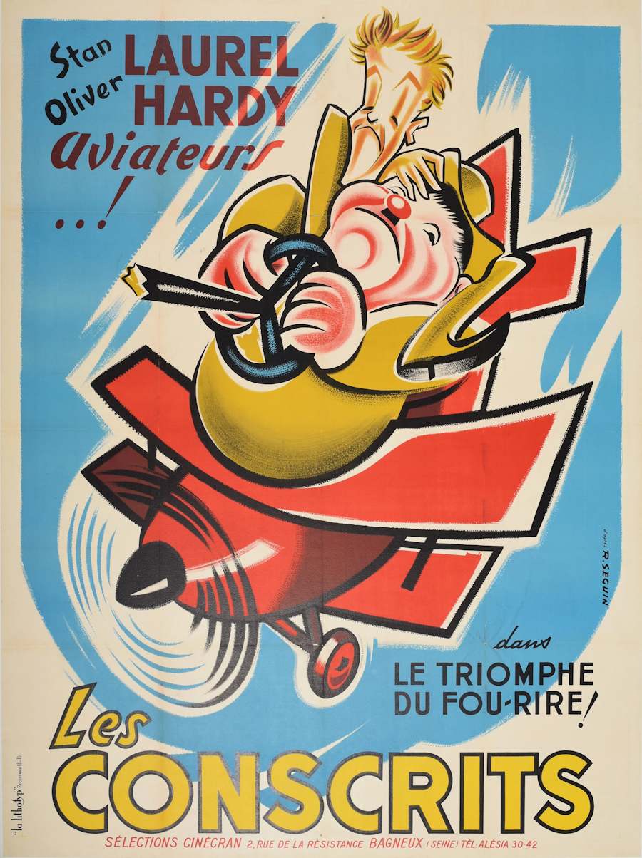 The poster is for the 1939 comedy film, The Flying Deuces, starring the famous duo Stan Laurel and Oliver Hardy. The French title of the film, used in this reissue poster, is Les Conscrit.