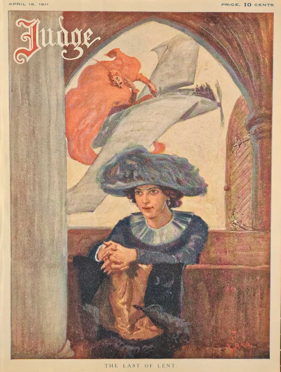 The satirical illustration, drawn by Charles Sarka, shows a pensive woman sitting under a Gothic arch. Above her, a diabolical figure in red robes approaches on a flying scroll, with a malicious grin.