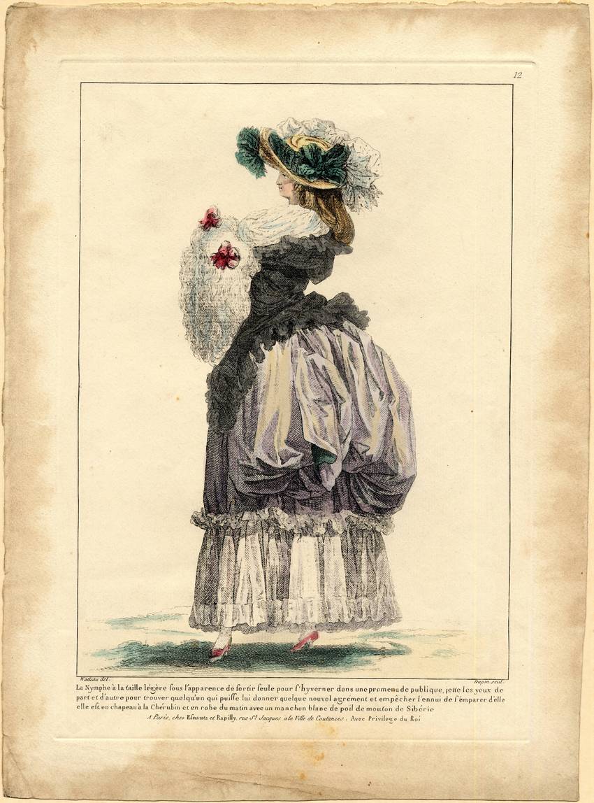 A woman wears a morning dress with a black bodice and short black overskirt. The underskirt is a gray purple and gathered and puffed up at the back. At knee height is a white ruffle and a lighter white tier that ends in another ruffle at her ankles. The woman’s stockings are white, and her high heeled shoes are pink. The woman has a white fichu or kerchief around her neck and carries a large white muff with two pink bows. Her hat appears to be straw, and is adorned with dark green bows and a spotted, white pouf of fabric. She is shown in profile.