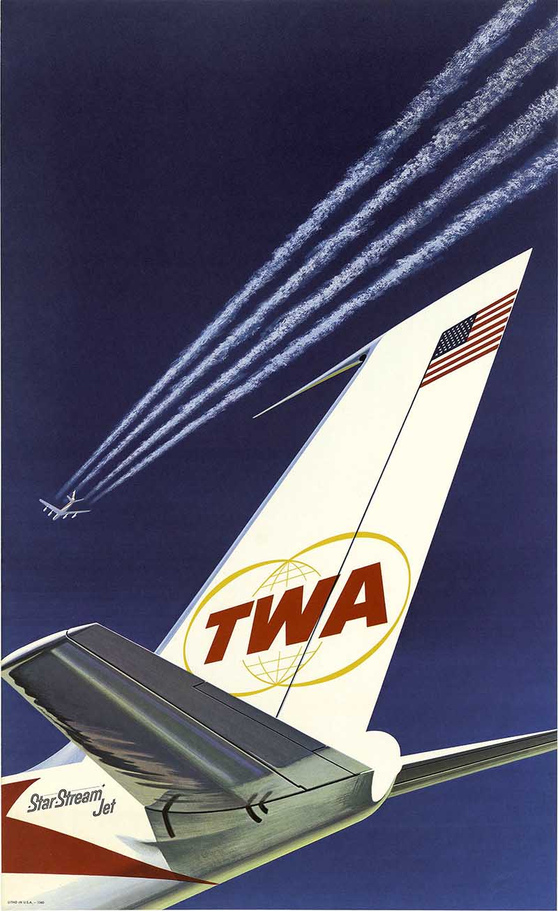 The poster features the tail of a Boeing 707 jet airliner, which TWA nicknamed the “Star Stream” service aircraft. A small, complete plane is visible in the distance, leaving condensation trails (contrails) in the deep blue sky.