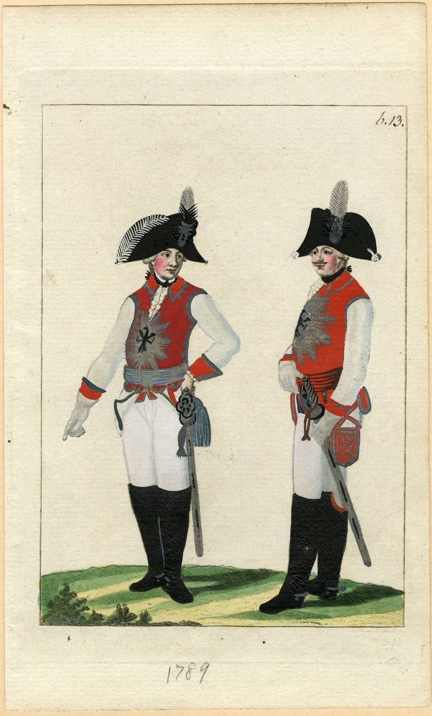Two gentlemen wearing military regalia stand in a field. They both wear black bicorne hats with feathers. Their uniforms have red vests, trimmed with silver at the arm holes, neck, and hem. At the center of the vest there is a Germanic black eagle crest on silver. They have white sleeves, with red cuffs trimmed in silver, white gloves, white trousers, and knee high black boots with spurs. Both gentlemen wear swords at the hip.