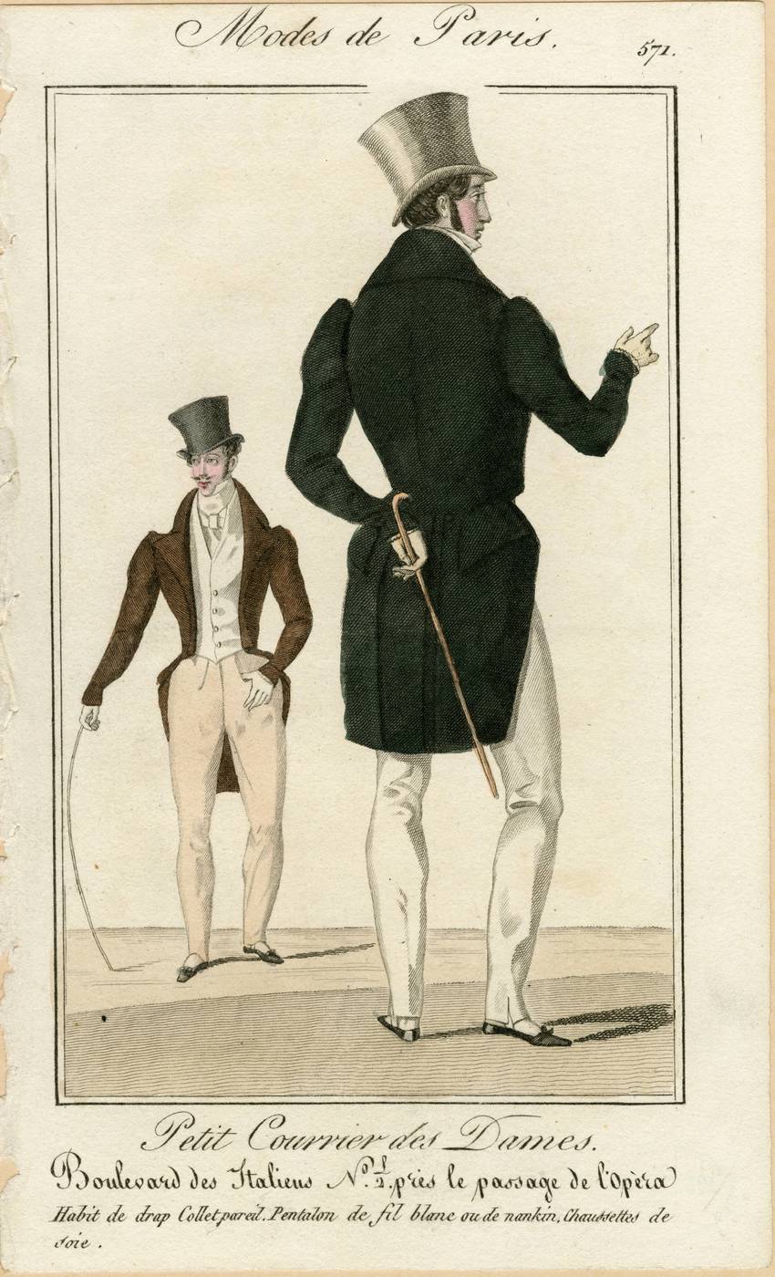 Two views, front and back, of Parisian men’s fashions are displayed in this illustration for Petit Courrier des Dames. The more distant gentleman on the left wears a white shirt and very tall cravat, white waistcoat with four buttons, tan stirrup trousers, and a brown tailcoat. His coat has wide square notched lapels, and sleeves with fullness at the shoulders. He wears a black top hat, white gloves, and flat black shoes with small bows. His trousers are strapped at the foot, and his hat is worn at a jaunty angle.