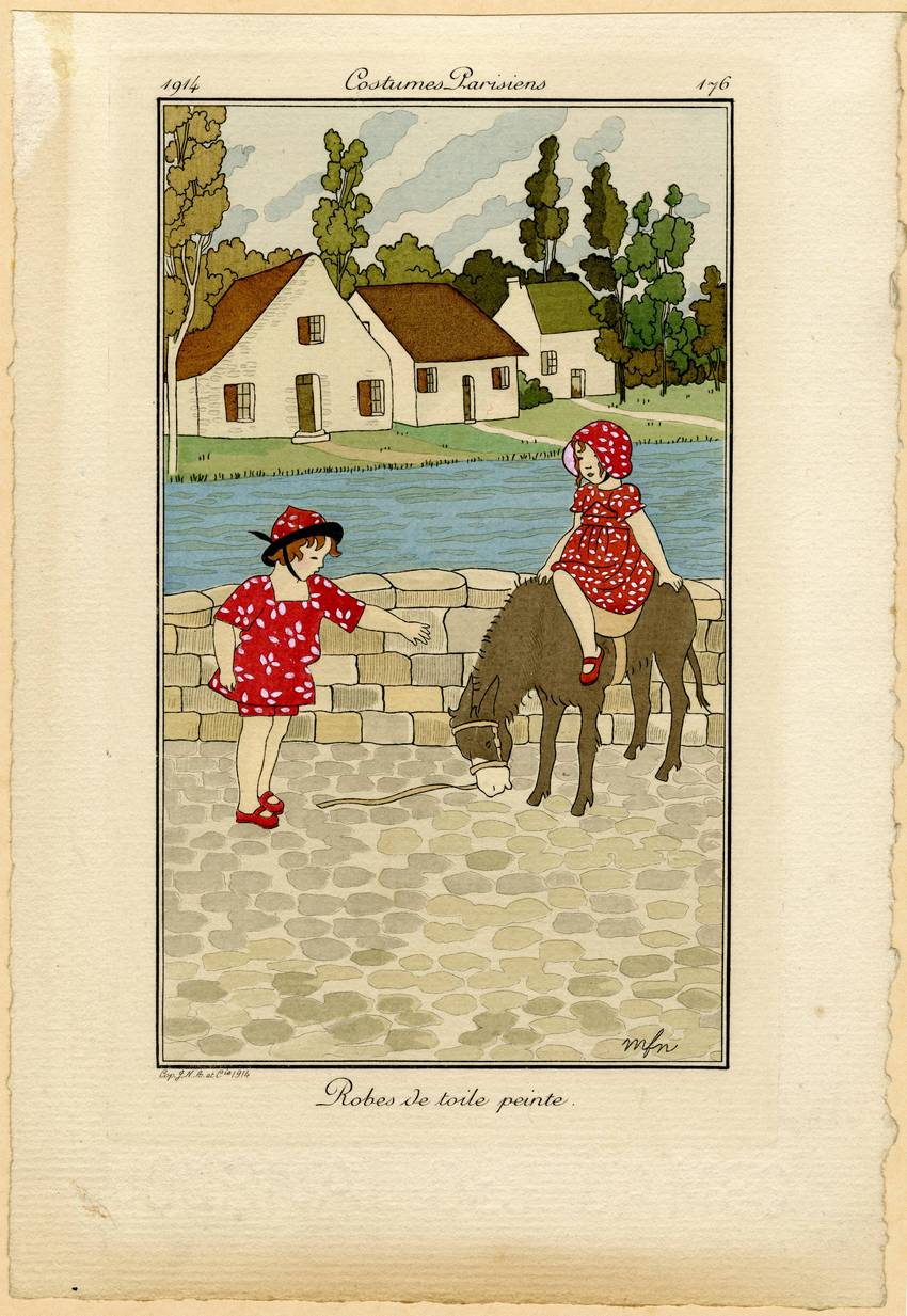 The child on the right wears the same material fashioned into a short, empire-waist full skirted dress with short puffed sleeves. She also wears red Mary Janes and a soft red fabric bonnet with a black chin strap. The two young girls stand on a cobblestone road with a stone wall and three white washed cottages are shown across the river with trees around them. This illustration belongs to a series of stylized drawings signed by “mfn,” entitled Costumes Parisiens for the Journal des dames.