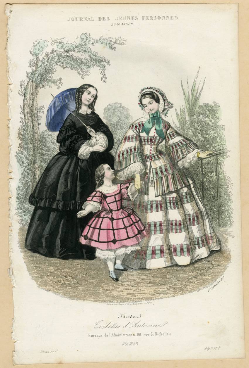 Taking a walk out of doors are two women and a young girl wearing French fashions for September 1857. The woman on the left wears a black full skirted dress with a white blouse. The bodice buttons down the front. The skirt and the sleeves have tiers with the upper tier on the skirt having a band of a wide black ruching at knee level. The sleeves have two puffed sections with a band of ruching above and below.