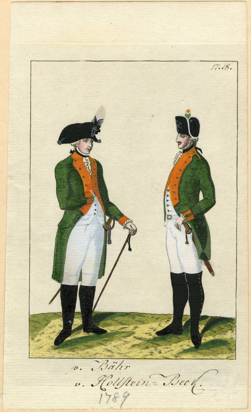 Two men in military uniforms with black, feathered bicorne hats wear knee-length, dark green coats with orange facings over a white vest, knee-length white breeches, and tall black boots. The man on the right has a mustache and also has gold buttons up the side of his boots. The man on the left holds a staff in his hand. Both men are wearing powdered wigs and have swords at their hips. Both men are standing outdoors on grass.