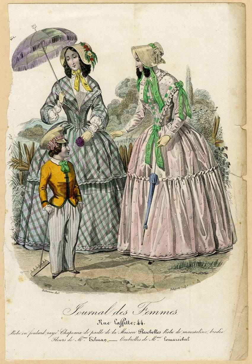 Similar scallops trim the wide lapels of her bodice. Her full skirt has two layers, the upper knee length and the lower to the ground. Both layers are hemmed with double scallops. She wears yellow gloves and a straw bonnet tied with yellow ribbons, and trimmed with daisies, red roses, and greenery. She carries an open lavender parasol with fringe, and she holds a purple flower. The woman on the right wears a dotted lavender dress The bodice has a narrow falling collar with a ruffled edge at a jewel neckline.