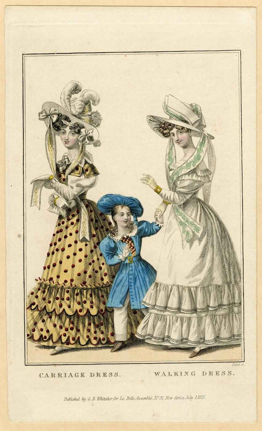 Two women and a child display their London fashions. The dark-haired woman on the left wears a carriage dress,while the light-haired woman on the right wears a walking dress. The woman on the right holds the hand of a small child. The woman on the left wears a dress of yellow with large red polka dots. The full skirt has two wide gathered flounces at the hem with scalloped hems bound in red.