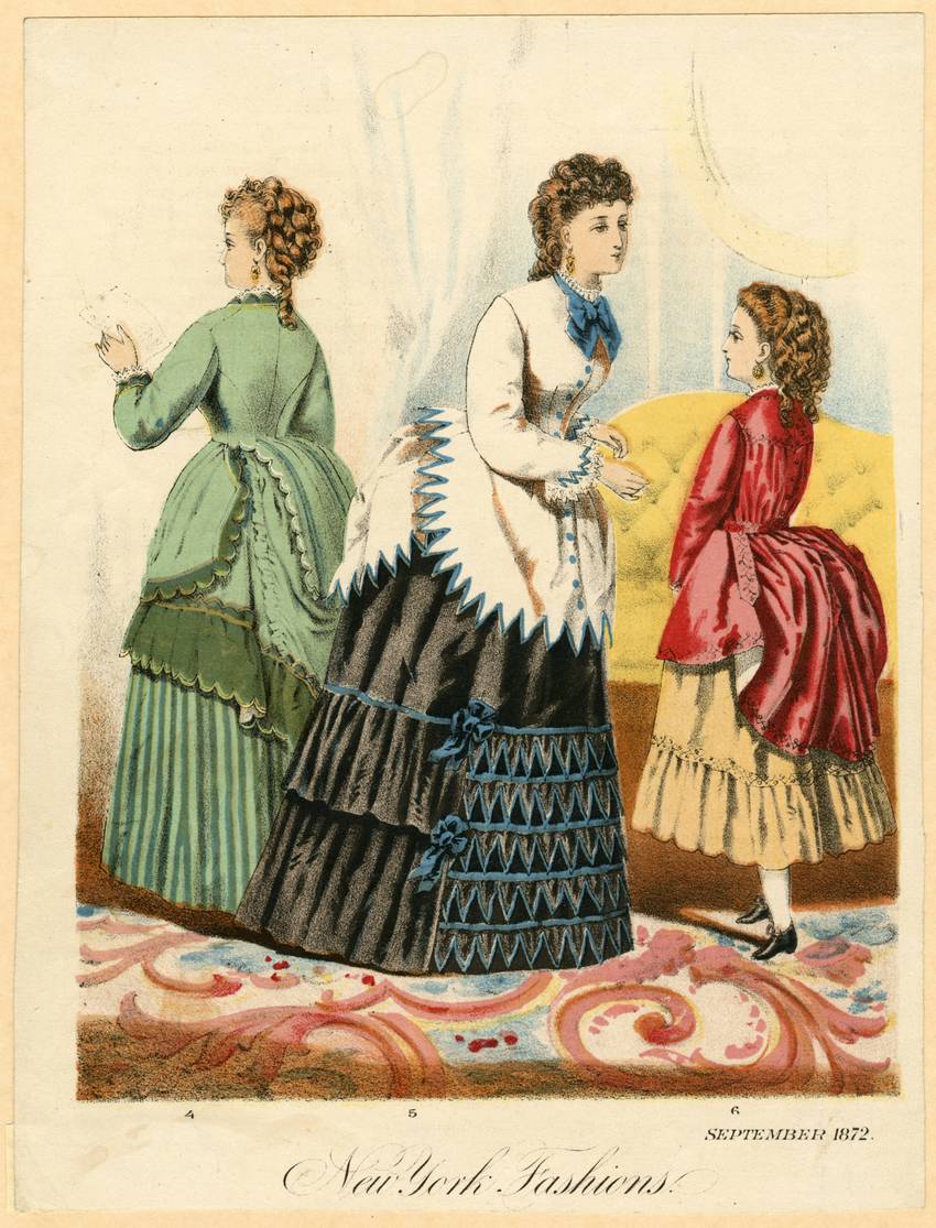 Standing in a well-appointed room, two women and a girl display their New York fashions for September, 1872. The woman on the left stands with her back toward the viewer so that we see the details of her outfit. Her ankle length underskirt has a pattern of light and dark green vertical stripes. Her cuirasse bodice with draped overskirt are a matching light green trimmed with darker green. The bodice fits snugly with princess seaming and narrow sleeves; the collar, cuffs, and hem of the are trimmed with scallop edging in dark green.
