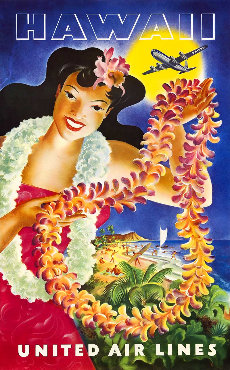 The image is a vintage travel poster titled “Hawaii.” It features a Hawaiian woman wearing a lei, with a beach scene and a United Airlines plane flying in the background.